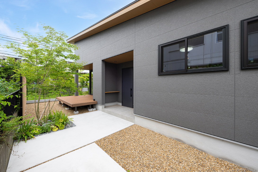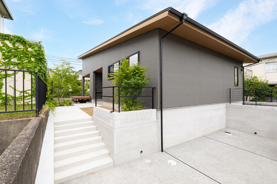 グレーの外壁と深い軒が描く静かな佇まい。