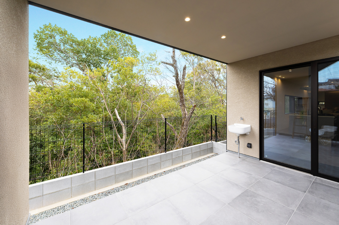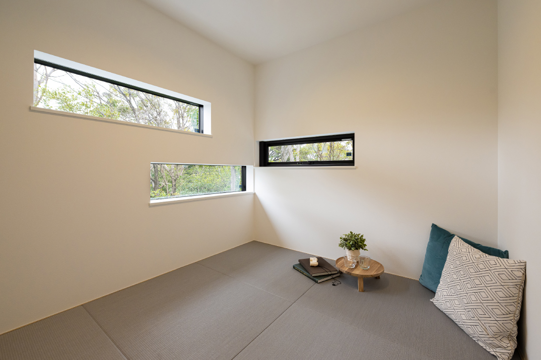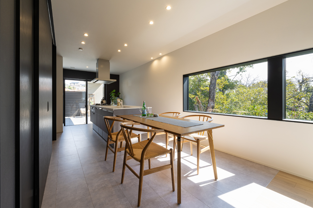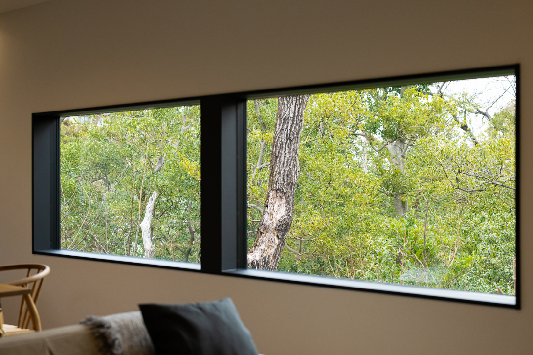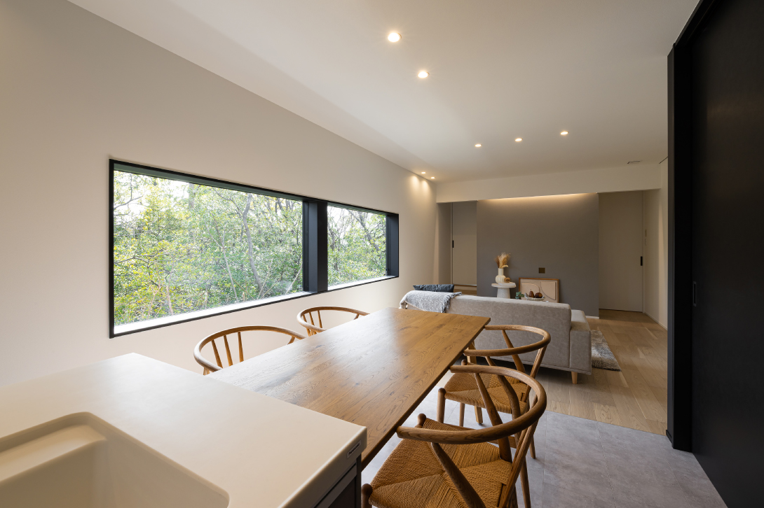 大きな窓から望むのは、季節の移ろいを映す借景の緑。