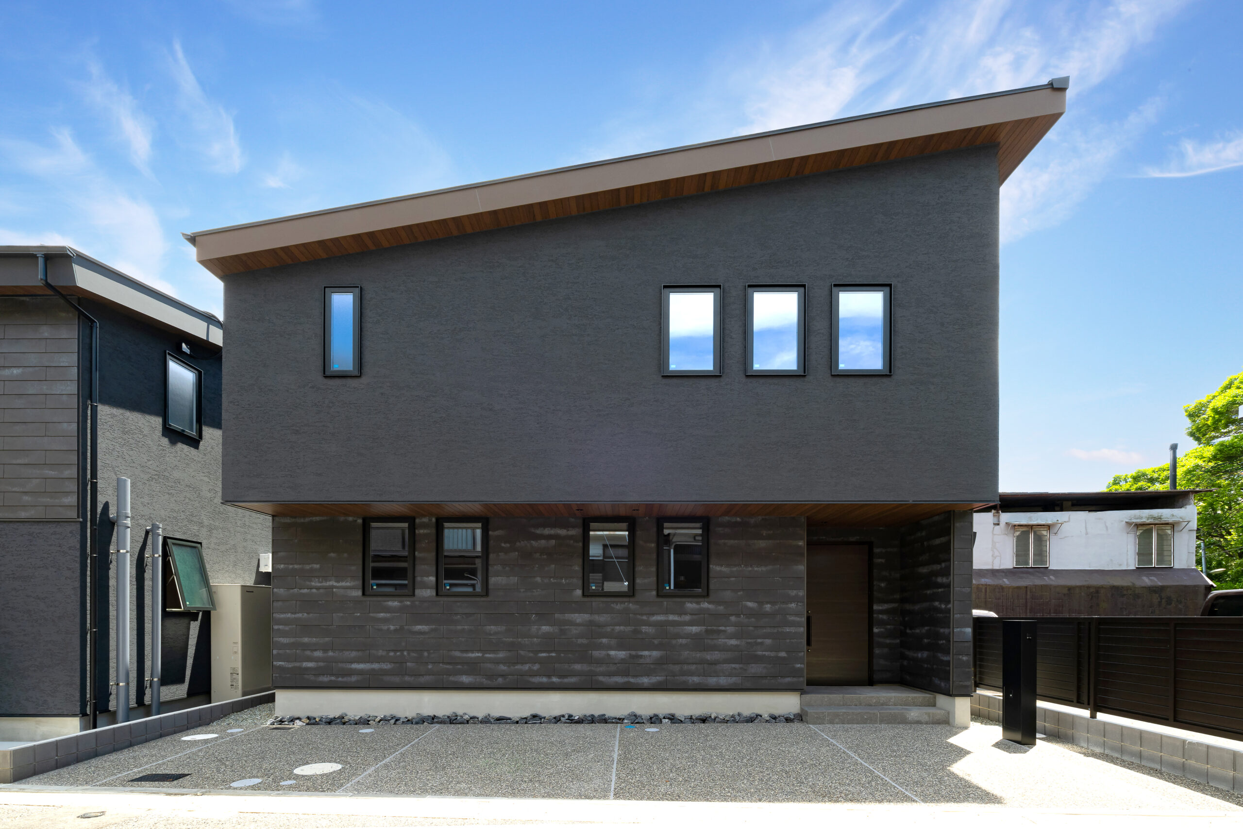 片流れ屋根とダークカラーで統一した外観が、落ち着きと存在感を放つ住まい。