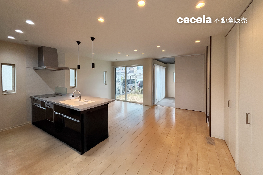 キッチンはデザイン性の高い人気のフルフラットタイプで、リビング・ダイニングから和室までを見渡せる設計。