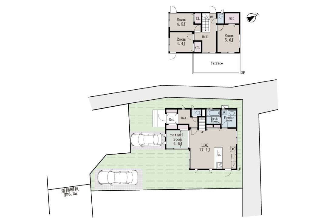 敷地内には駐車スペース2台分を確保。前面道路は南側約6.3mとゆとりがあり、車の出し入れもスムーズです。