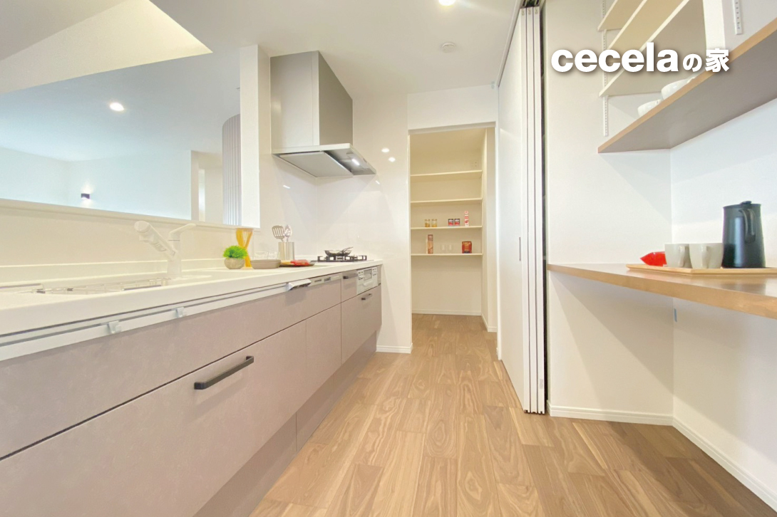 キッチンの背後には、2列に並ぶ大型パントリーと、奥へのパントリー、ファミリークローゼット、ランドリーへとつながる効率的な家事動線を確保。