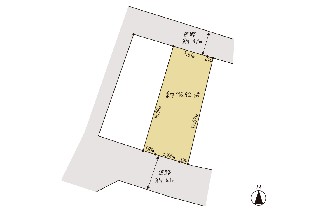 外構には、並列2台分の駐車スペースを確保。前面道路は約6.1mとゆとりがあり、車の出し入れもスムーズ。南向きの立地により、日当たりも抜群です。