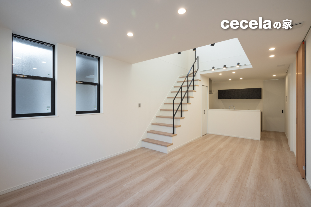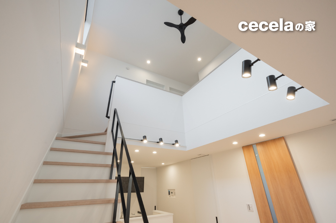 1階のLDK+UTは約21.2帖。LDK上部には吹き抜けを採用しており、自然光が差し込む明るく開放的な空間が広がります。