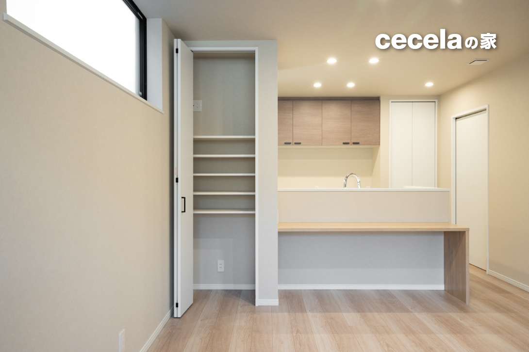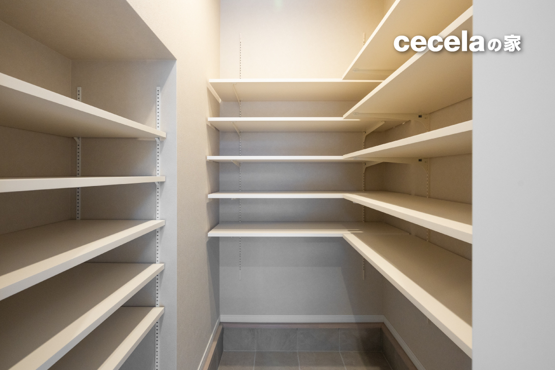 キッチンの奥にはパントリーが設けられており、食材のストックや調理家電の収納に便利。