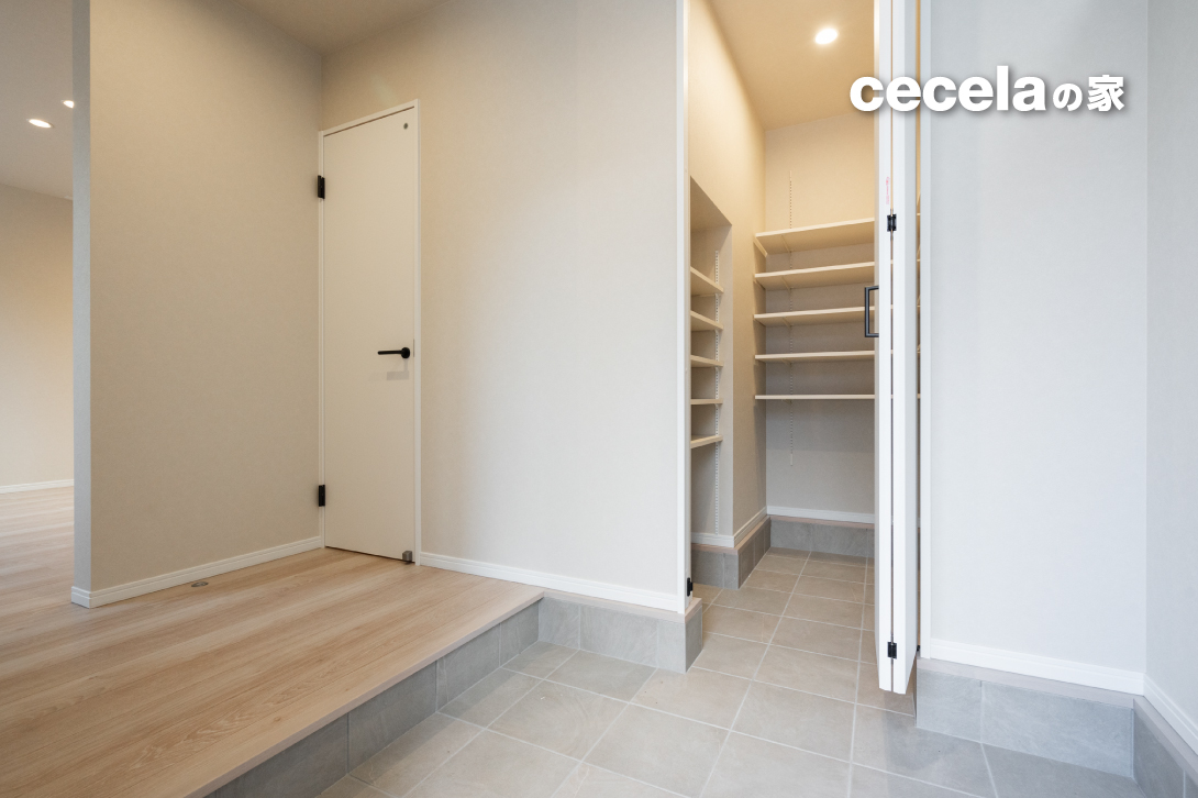 玄関にはシューズインクローゼットを設け、外遊びの道具や季節物の収納にも便利。