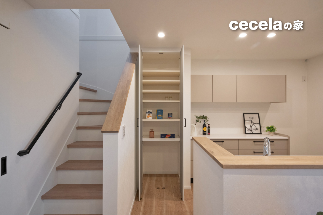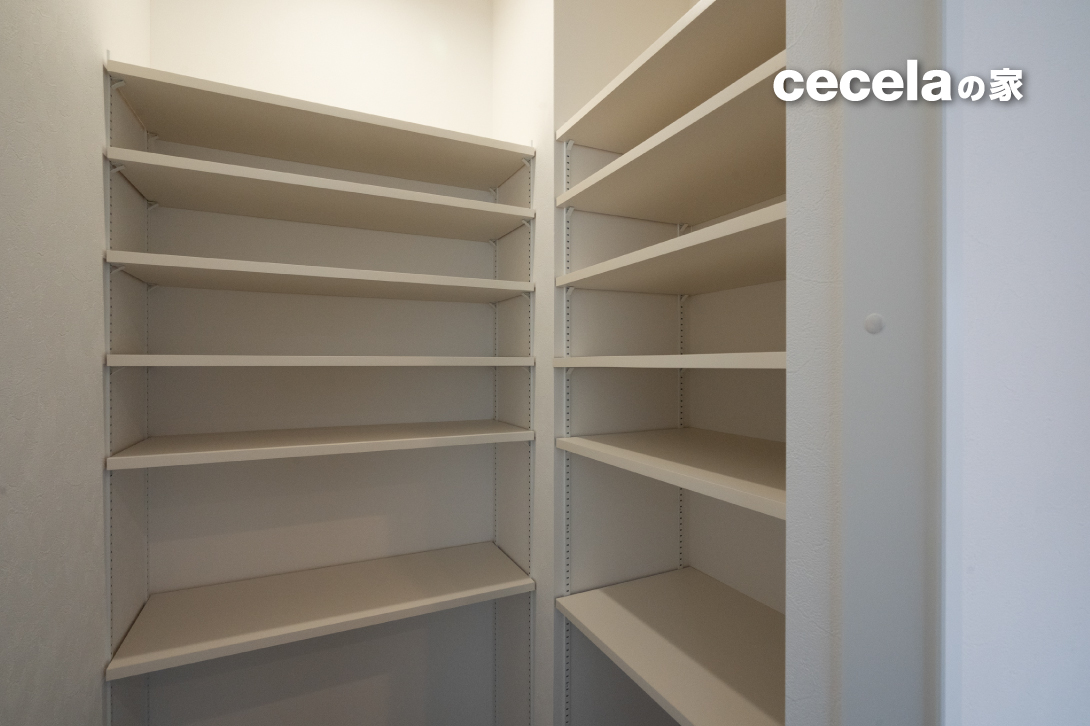 キッチンはパントリー付きで収納力が高く、食材ストック・日用品などをまとめて保管できます。