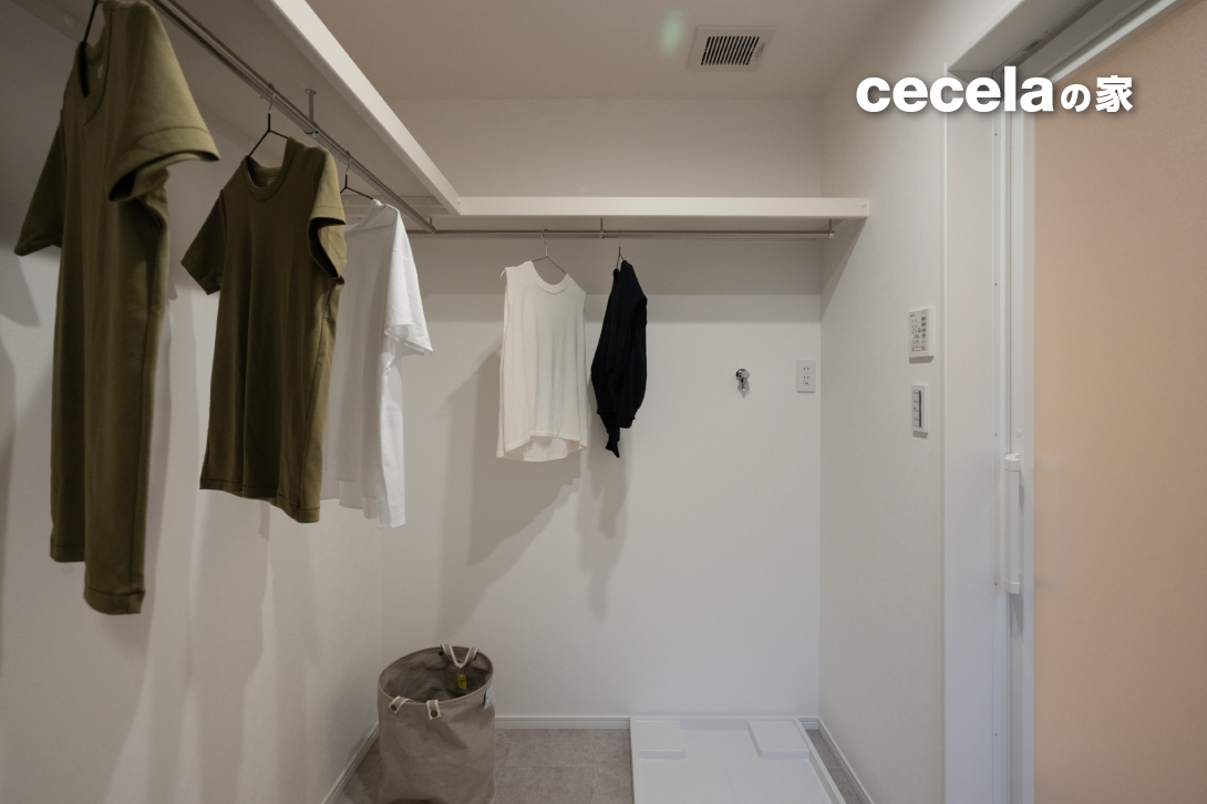 広々としたランドリールーム、洗面室、浴室が一直線上にまとまっており、洗濯 → 干す(室内干し)→ しまう の工程を短い距離で効率よく完結できます。