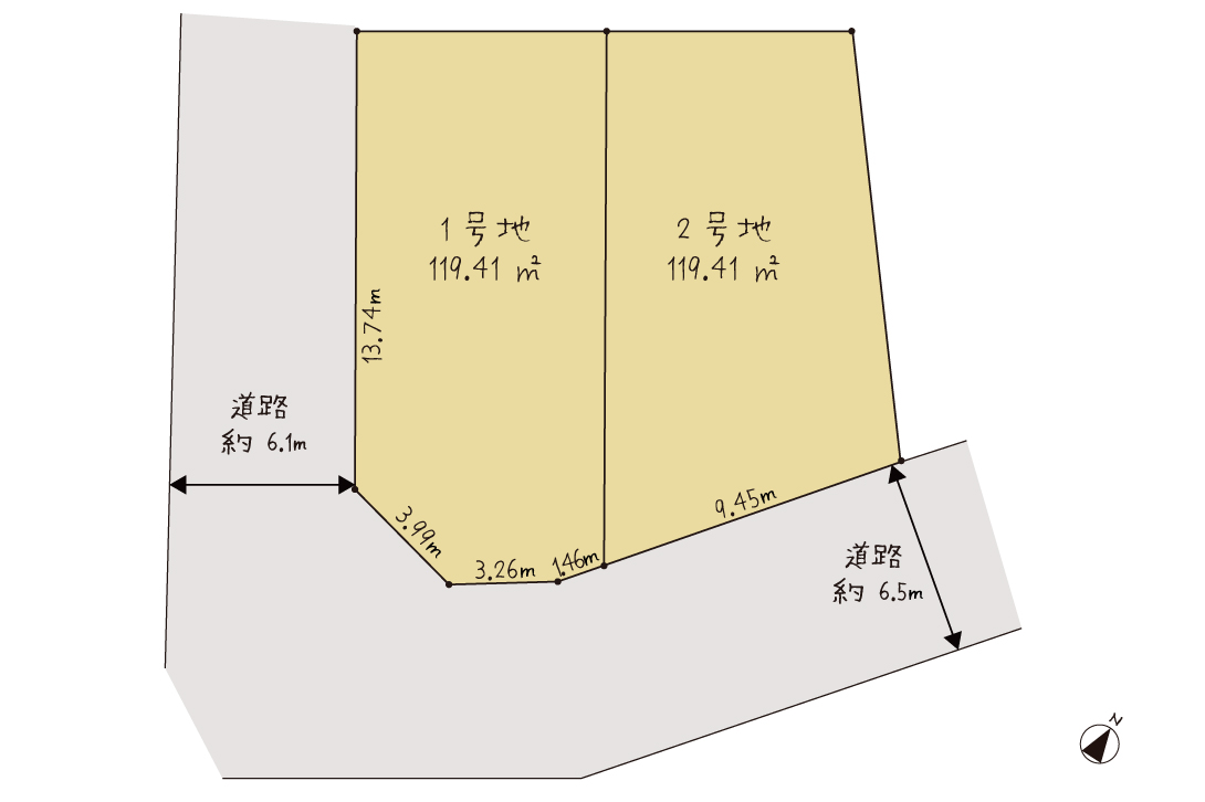 敷地面積は119.41㎡(約36坪)。西側約6.1m・南側約6.5mのゆとりある道路に面した角地で、陽当たり・通風ともに良好。