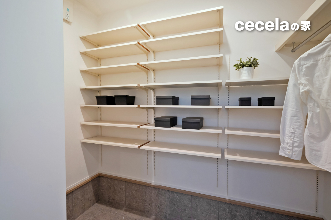 玄関には大型のシューズインクローゼットを配置。靴だけでなく、アウトドア用品や季節物の収納にも便利です。