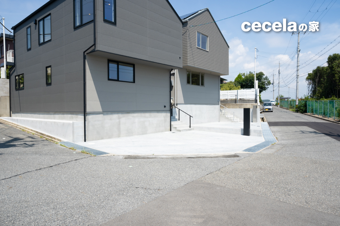 建物は延床約105.09㎡の3LDKプランで、落ち着いたグレーカラーの外観が印象的。街並みに馴染みながらも存在感のあるデザインです。
