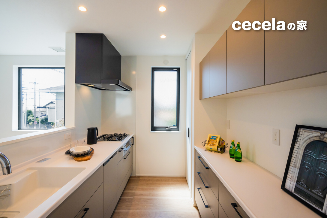 キッチンは対面式で、リビング・ダイニングを見渡せる設計。背面にはカウンターと棚を設け、食器や調理家電の収納を効率的に。