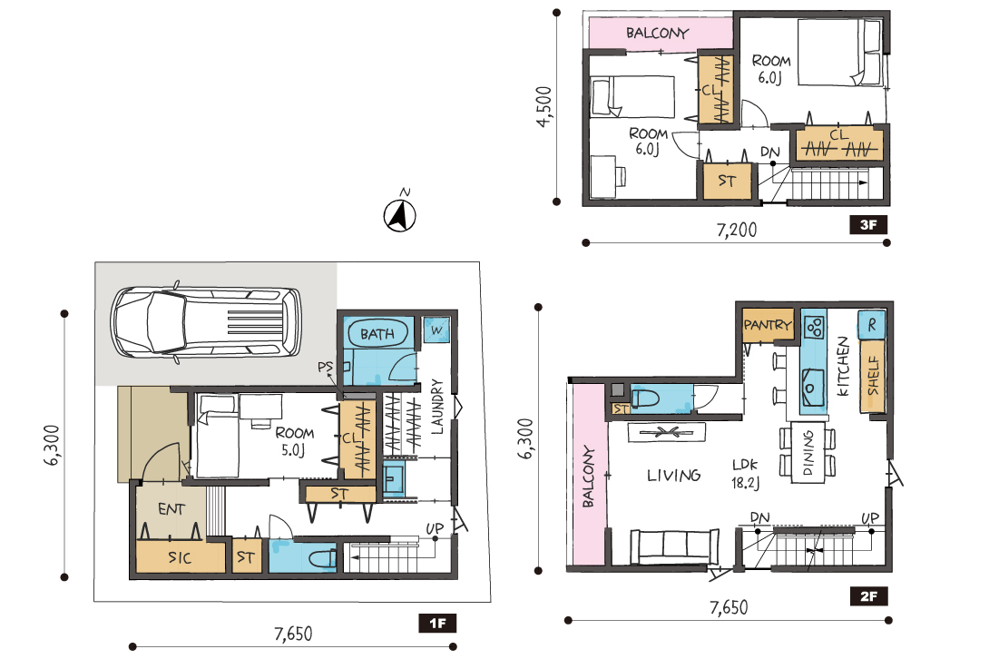 間取りは3LDK。特に2階のLDK(18.2帖)はL字型リビングになっており、ソファやダイニングセットの配置に自由度があるのが魅力。