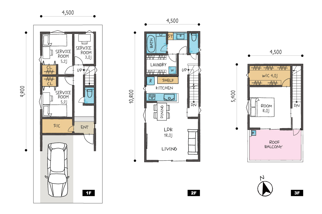 間取りは1階にサービスルームを3部屋、2階にLDK、3階に主寝室という構成です。