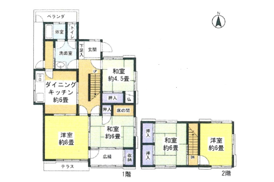 建物は1階にダイニング・キッチン+和室×2+洋室などを配置し、2階にも和室・洋室を各1室を備えた実用性の高い間取り。
