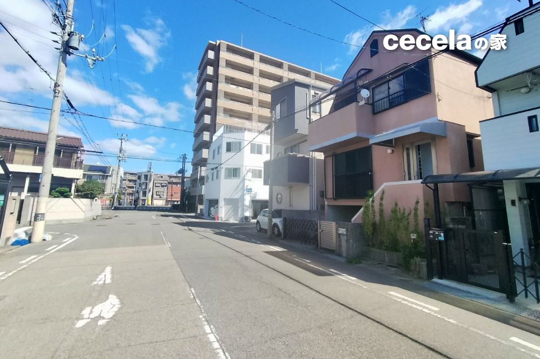 現地は前面道路幅員が約11mと非常にゆとりがあり、敷地全体に開放感が生まれるだけでなく、車の出し入れや来客時の駐車スペース確保にも安心感があります。