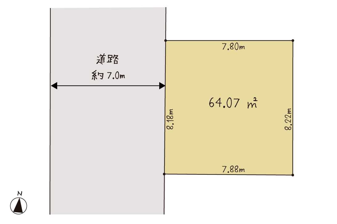 敷地面積は64.07㎡(約19.38坪)。前面道路は幅約7.0mと広く、車の出し入れもスムーズ。