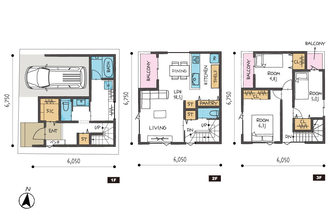 間取りは3LDK。1階に玄関・SIC・水廻りを設置し、生活・家事動線が考えられた使いやすい設計です。