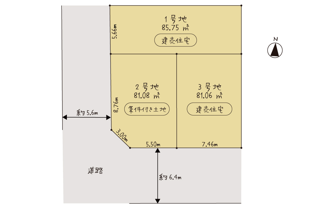 敷地の前面道路は約5.6mとゆとりがあり、駐車やすれ違いもスムーズ。車1台分の駐車スペースを確保しながら、ファミリーでの暮らしに必要な空間をしっかり確保しています。