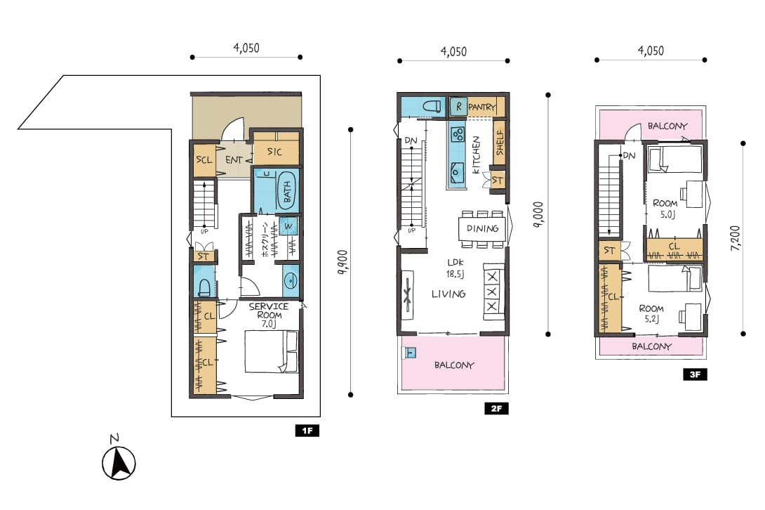 建物は木造3階建て・延床面積107.12㎡の2LDK+サービスルームプランで、耐震等級3+制振ダンパー標準装備、BELS対応(UA値0.36)と高い安全性と省エネ性を兼ね備えた設計です。