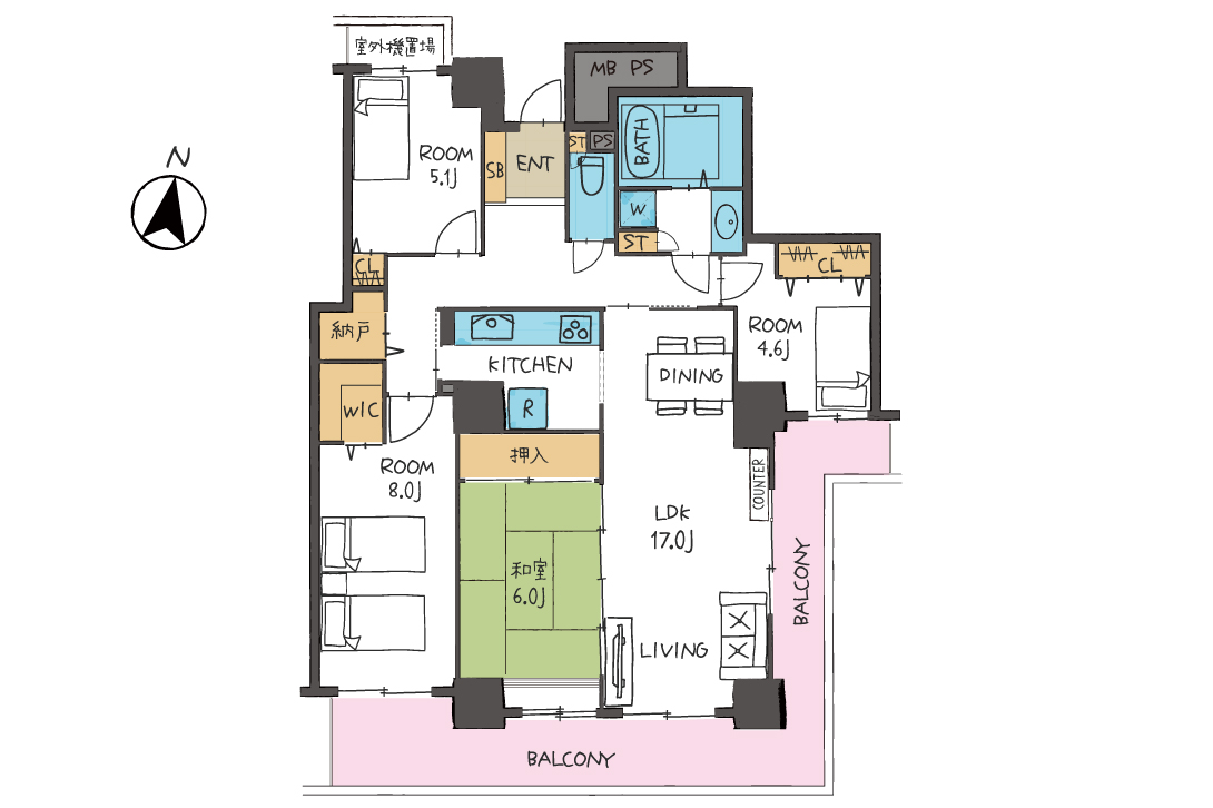 洋室は8帖・5.1帖・4.6帖の3部屋構成。主寝室や子ども部屋、ワークスペースなどに分けて使うことで、家族それぞれのプライベート空間を確保できます。