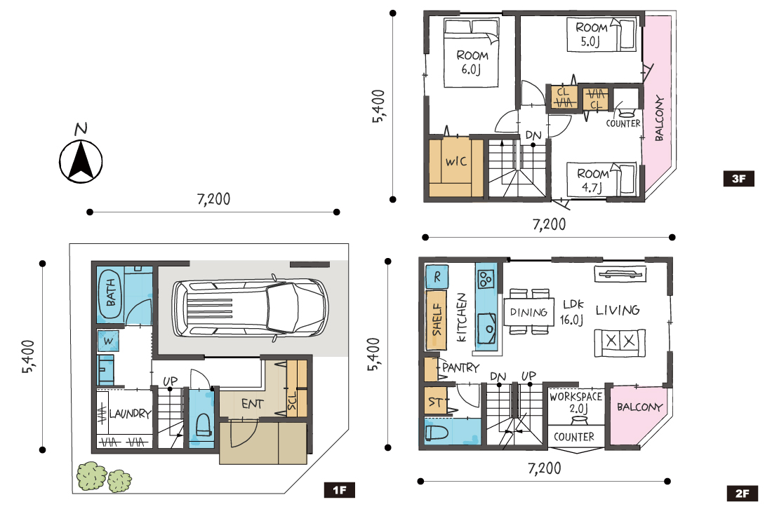 間取りは3LDKプラン。1階はビルトインガレージと水まわりをまとめたフロア構成です。