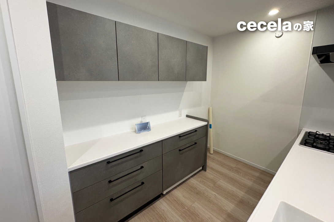 2階はLDKを中心にしたパブリックスペース。キッチン背面には収納棚やパントリーを設けており、食器やストック品をすっきりしまえるため、いつでも片付いた状態をキープしやすいのもポイント。