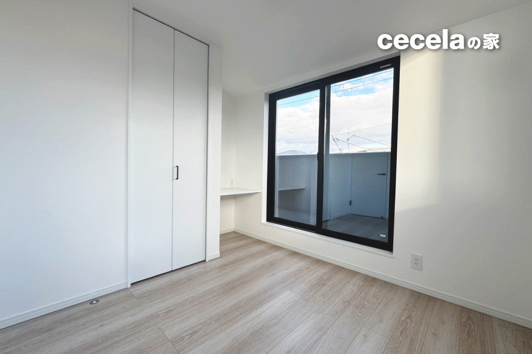 全居室に収納を設けているので、家族それぞれのプライベート空間を確保しながら、すっきり片付く暮らしが実現します。バルコニーも備えており、寝室から外の空気を感じられるのも魅力。