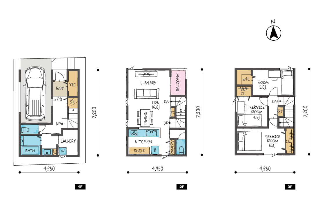 建物は3階建ての1LDK+2サービスルームプラン。1階には洗濯・乾燥・収納がスムーズにこなせるランドリースペースを確保し、忙しい毎日の家事効率をサポートします。