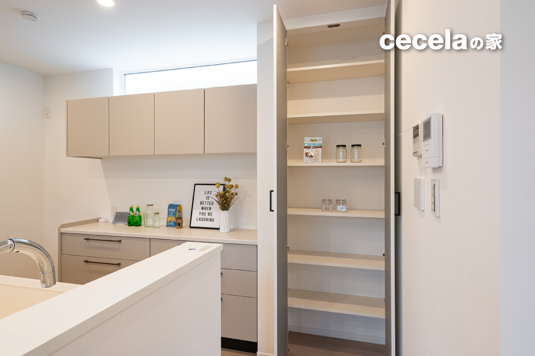 2階のキッチン脇には、食品やキッチン小物のストックに便利なパントリーを完備。生活感を見せないすっきりとしたLDKを演出できるだけでなく、買い置きもしやすく、忙しい日々の家事効率を高めてくれます。