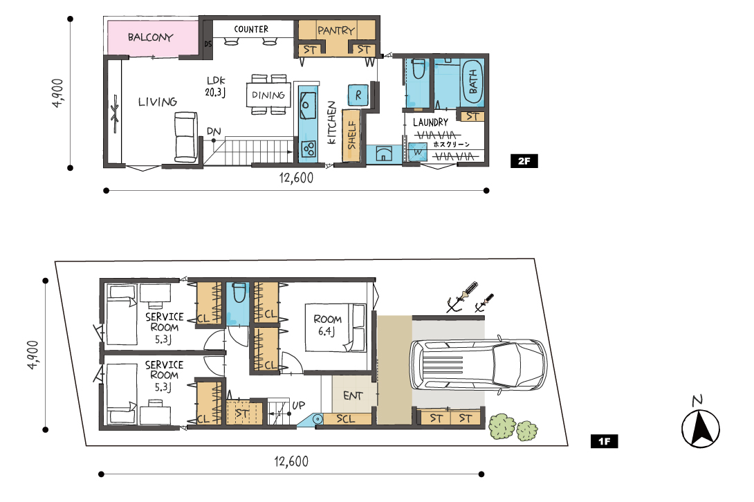 2号地の住まいは、1LDK+2サービスルーム・延床110㎡超の新築戸建。