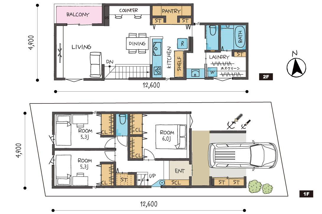 1階には玄関収納(SCL)や廊下に収納を設置し、
