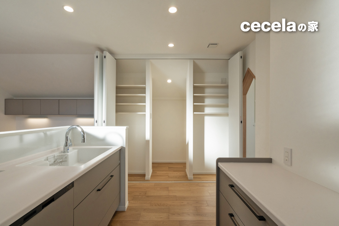 キッチンまわりには大容量のパントリーを設け、