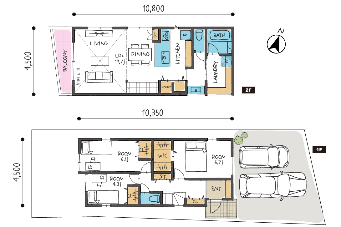 1階には主寝室と洋室を配置し、ウォークインクローゼットなど各居室に収納を確保。