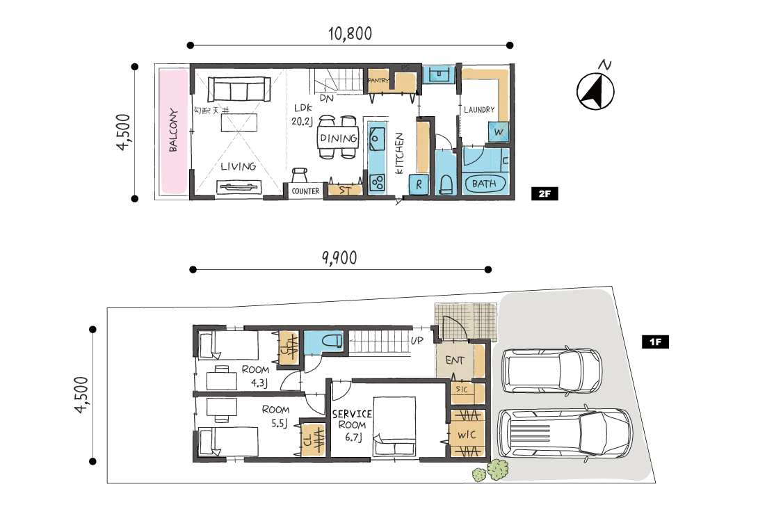 1階にはサービスルーム6.7帖と洋室5.5帖・4.3帖を配置。